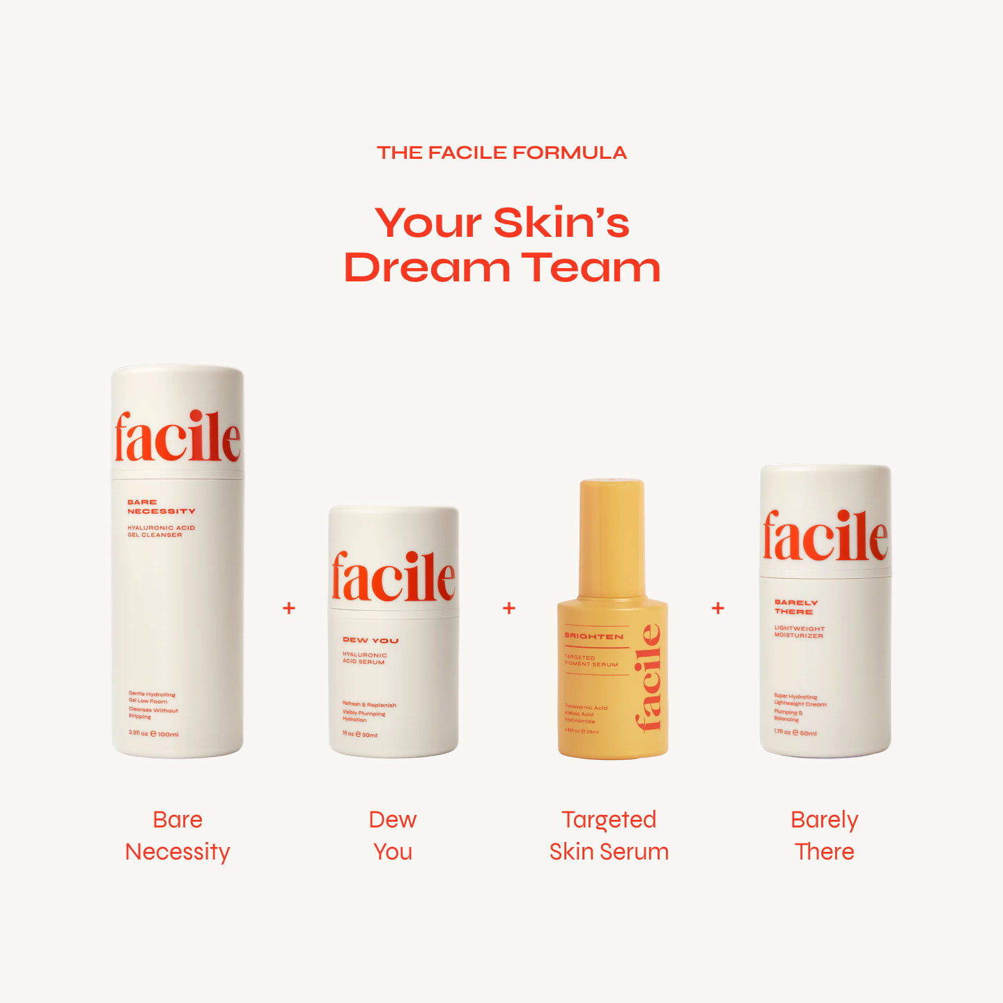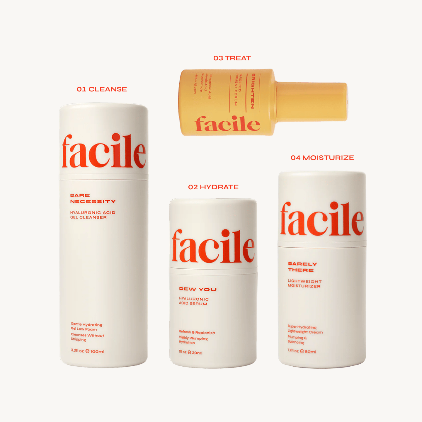 Facile means easy (by definition). Developed by board-certified dermatologist Dr. Nancy Samolitis, we’re all about clean, non-irritating formulas. Our responsibly packaged everyday essentials and targeted treatments are clinically proven, effective, and always under $40. Because good skin should be easy.